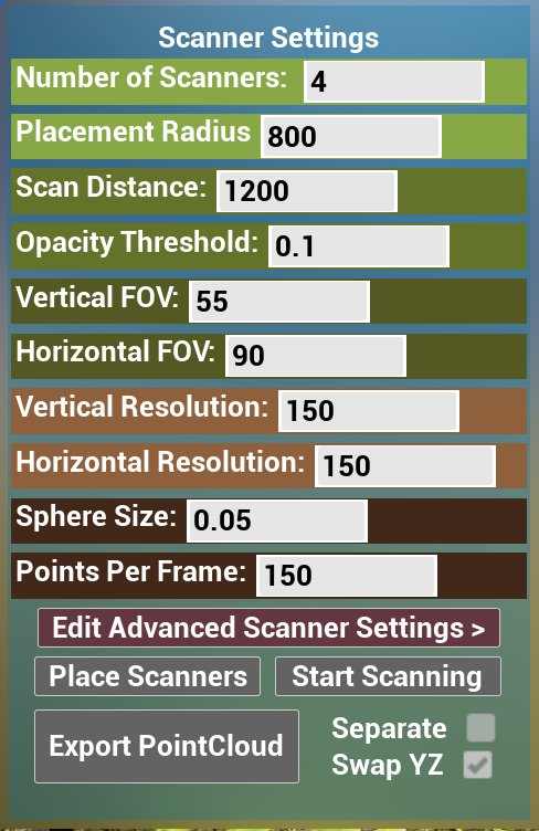 Ceiling (ALS-like Mode): Scanners are positioned above the player at a height equal to Placement Radius. They look directly downward, simulating an ALS (Airborne LiDAR Scanner).