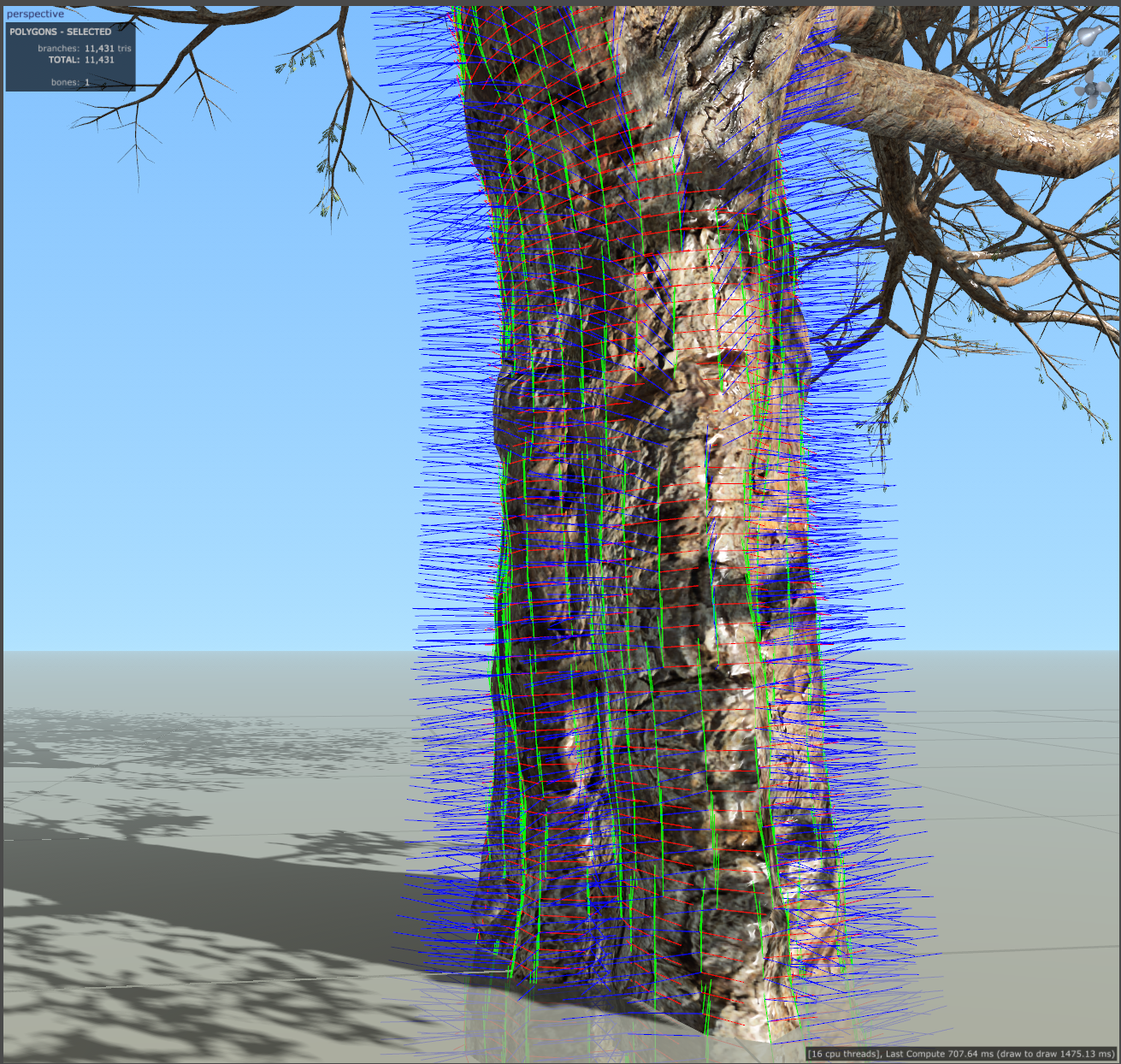 By now, your tree model should be highly detailed, with a significant number of triangles (tris) contributing to its complexity. For generating a dense and high-fidelity point cloud, I typically aim for models with over 800,000 tris. This level of detail provides excellent coverage of points, ensuring that the resulting point cloud captures the intricate features of the tree.