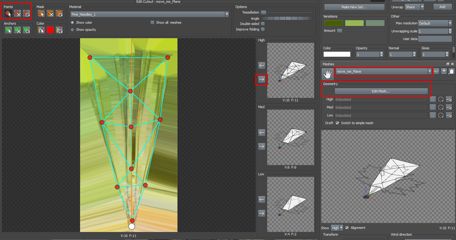 This tab allows you to select and modify the mesh associated with your leaves, fronds, or batched leaves.